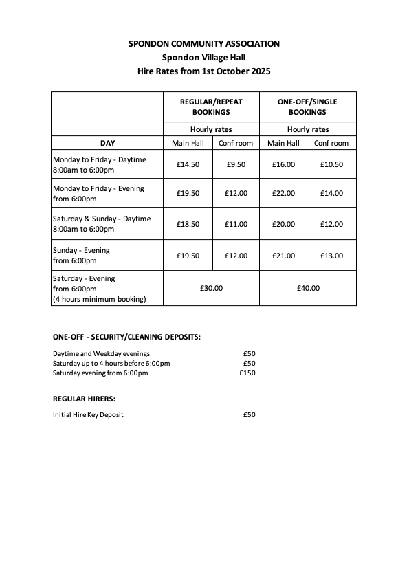 For further details and bookings please use the online enquiry form, which is sent directly to the Hall Manager (note that the "Contact us" link at the top of the page is for general queries about the Spondon Online website).